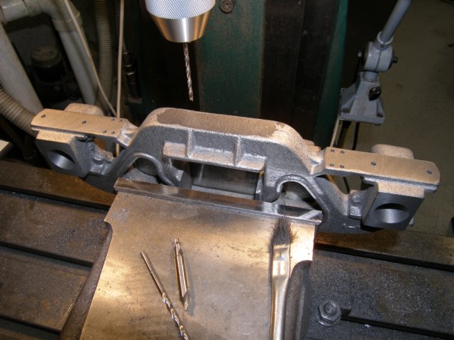 The first step in machining the sideframe is to clamp it to the mill table on blocks and shims to get an aveerage level. The rest of the machining will be done from the refrence surfaces machined during this step. I machinde the inside surface of the bearing journals, the brake mounting bosses, the bolster slide plates (sides and inside surface), and the bottom of the bolster opening (wher the spring plate will me mounted).